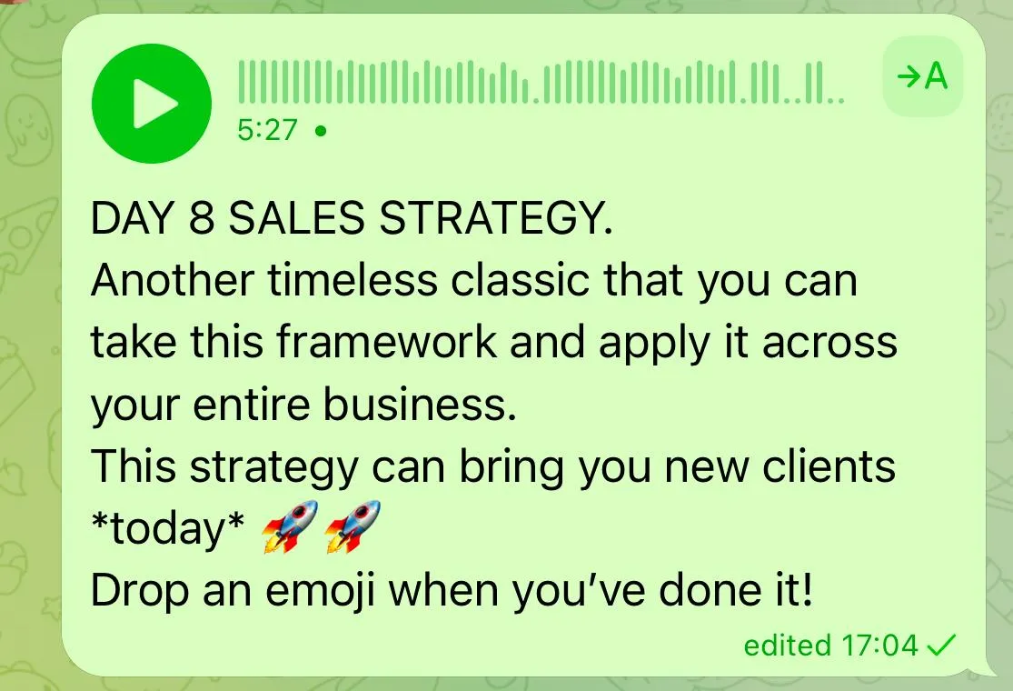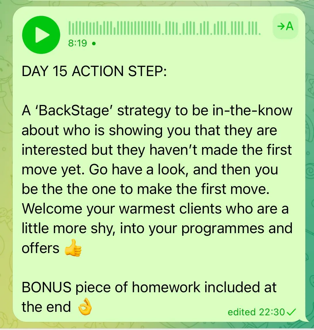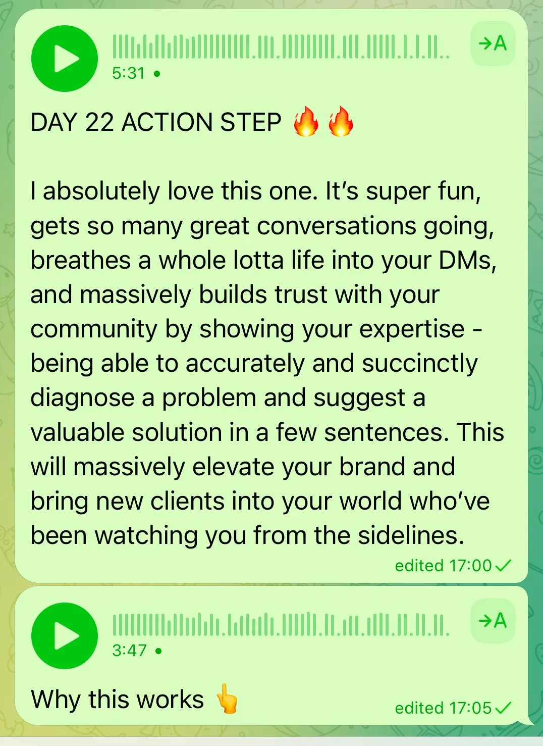 - 30 x voice note trainings with a specific action step to increase your sales and sign high ticket clients