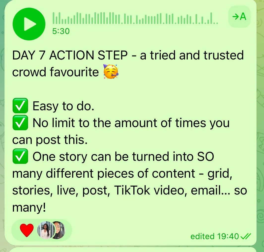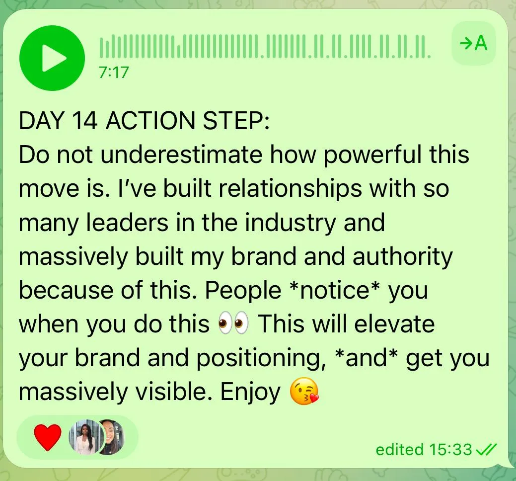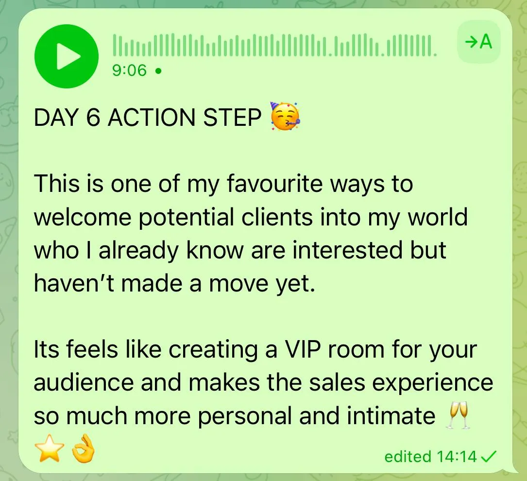 - 30 x voice note trainings with a specific action step to increase your sales and sign high ticket clients