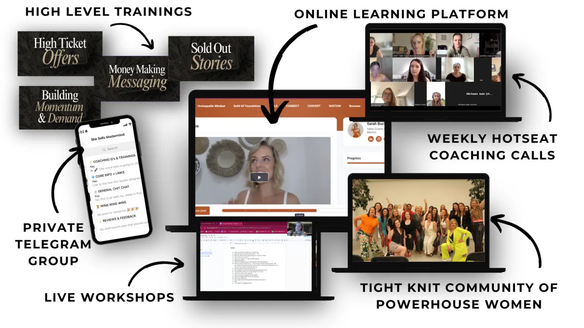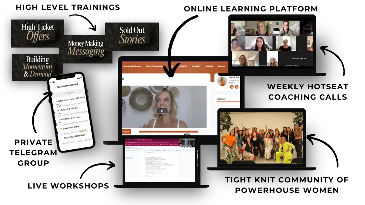 A: She Sells is perfect for coaches, consultants, experts, mentors, online service pro's, course creators and CEO's who want to increase their sales - online, offline, in person. This mastermind is for people who want to sign premium clients on social media, increase their cash flow, improve their messaging to call in aligned clients online, and build a solid and repeatable sales system for their business.